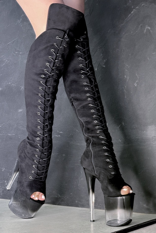 Hella Heels The Glitterati Open Toe Over The Knee 8inch Boots - Sin City