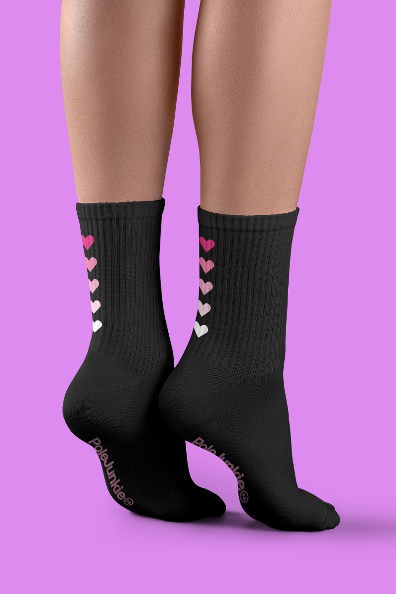 Show your love from the ground up with Pole Junkie Hearts Socks - Black. Featuring a dreamy heart ombre design, ribbed comfort, and a stretchy fit—style meets performance effortlessly! ❤️