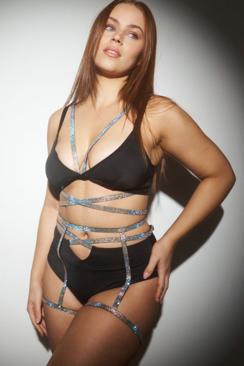 Behold the allure of the Lunalae Ivy Diamante Top in Black. Crafted with adjustable straps and removable cups for a custom fit. Its shimmering diamante waistband and low-stretch fabric ensure unrestricted movement, while the triangular design adds a touch of elegance.