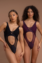 Unleash your inner shadow. This black bodysuit is pure after-dark energy, designed with a scoop neckline and a dramatic open back. Sheer mesh panels and sly cut-outs are framed by tonal black piping, finishing with a cheeky, high-leg cut. A classic, reborn with an edge.