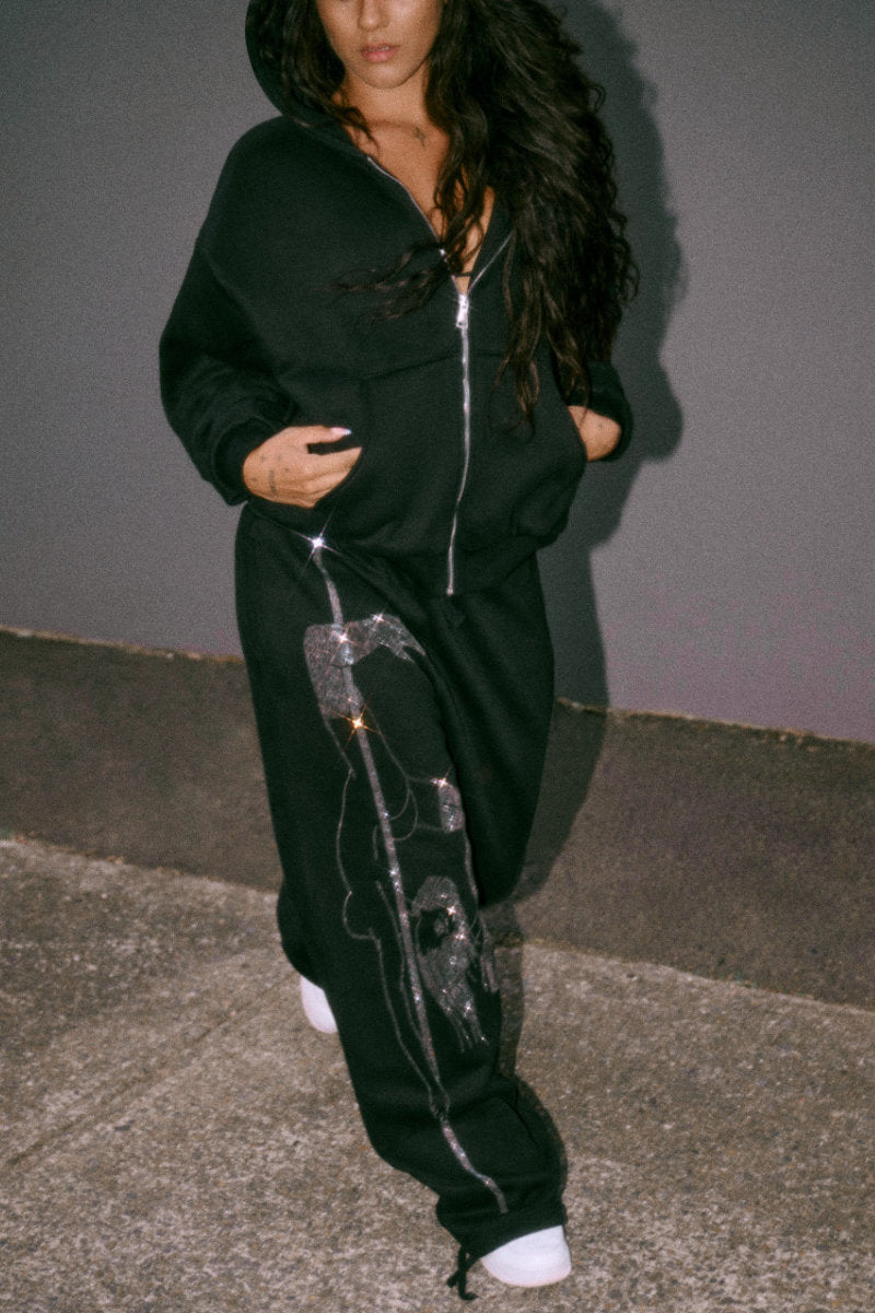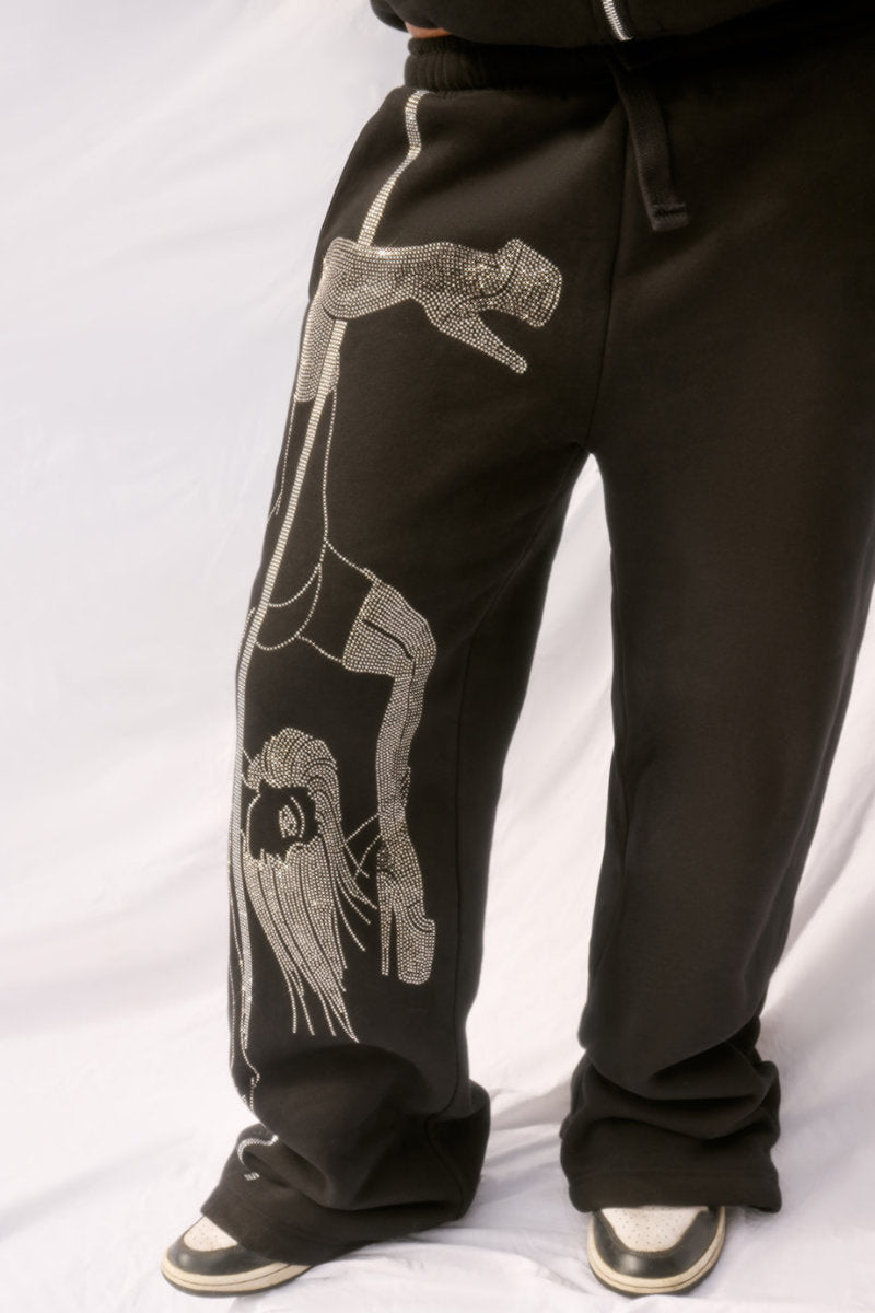 CXIX Anime Pole Dancer Wide Leg Sweatpants – Ep 2 Black Silver Rhinestone