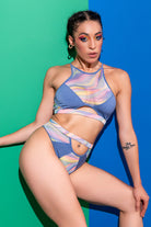 Meet your new go-to! The RAD Lilly Top is daring, glamorous, and romantic. Crafted from glittery sea blue fabric and soft pastel rainbow mesh, it features full back coverage with a trendy lined mesh overlay—you can even wear it two ways. The elegant halter-like neckline adds a touch of sophistication. Embrace the whimsical, nostalgic hues of pink, blue, yellow, green, and lavender, and feel empowered in this essential piece that celebrates your unique style.
