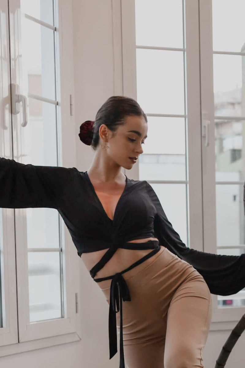 A black sensual shirt pairs flawlessly with matching sensual pants for a striking look. Long straps offer versatile styling options, while a unique seam “hole” allows you to thread a sash and cinch the shirt at your waist. Perfect for high heels classes, this airy, delicate ensemble enhances every stiletto step with seductive grace.