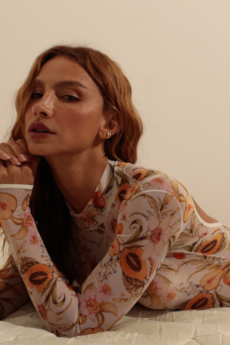 Serve pure garden-of-eden temptation with a delicate print of strawberries, papaya, and peaches. High neck elegance meets a daring high leg cut and super cheeky fit, lengthening every line. The long sleeves add sophistication, while the peek-a-boo back with a ribbon tie closure ensures you look just as good leaving the room.