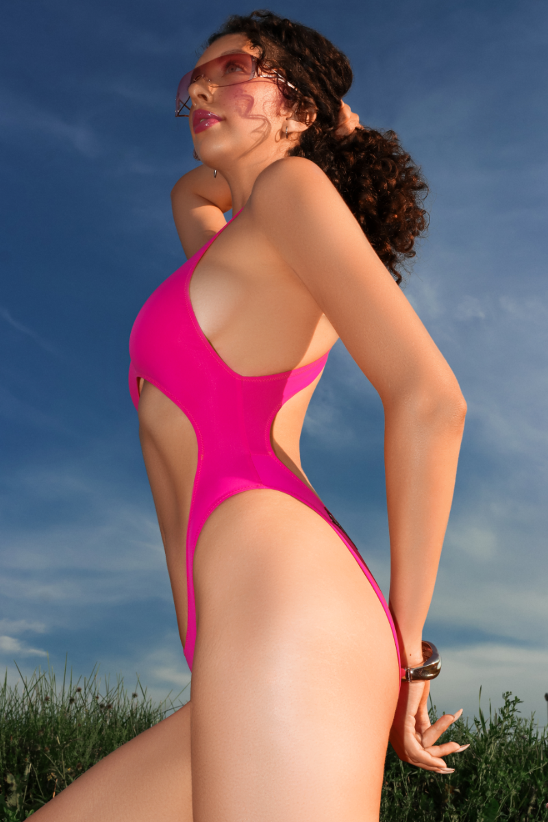 On Wednesdays, we wear pink. But you'll want to wear this every day. This hot pink, double-lined bodysuit is totally fetch. Featuring a scoop neckline, low rise, and daring cut-outs that lead to a cross-back detail. The high leg cut serves maximum confidence. You can sit with us.