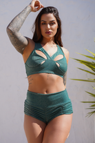 Unleash your wild side. This jungle-green lurex top is pure, untamed energy. A supportive fit with thick straps and a racer back lets you move freely, while subtle cut-outs at the V-neckline add a flash of mystique. Capture the spirit of carnival, made for the studio.