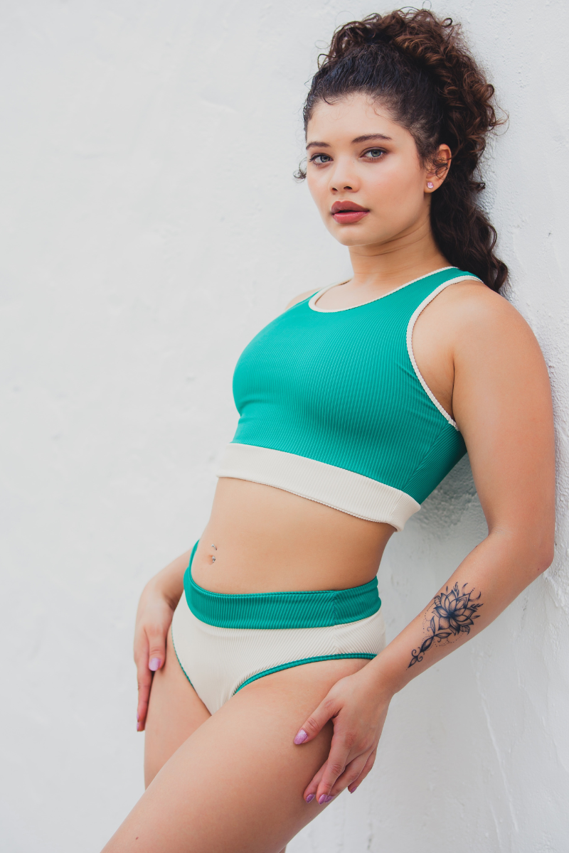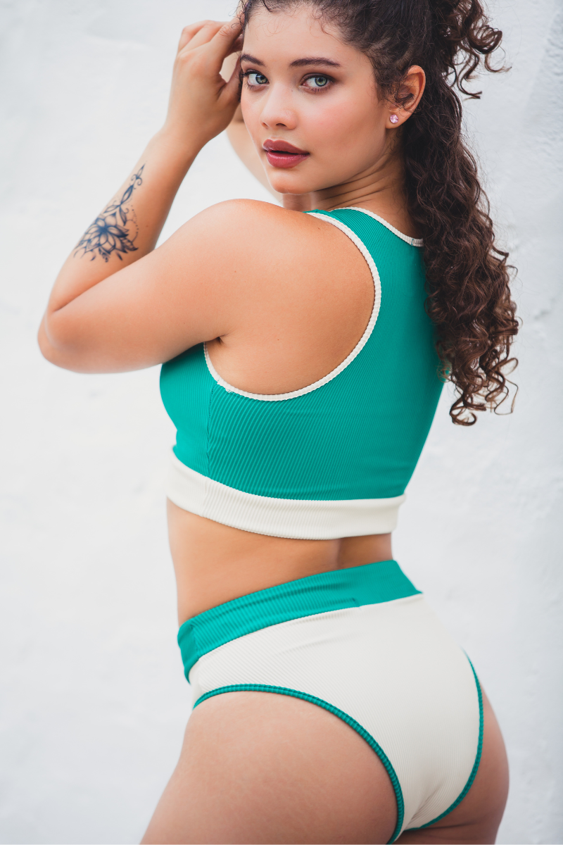 High-waisted, retro, and unapologetically cheeky. With a flattering high-leg cut, bold colour-block design, and double lining for confidence, these white and green beauties are made for pole dancers who love to move in style.