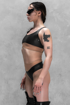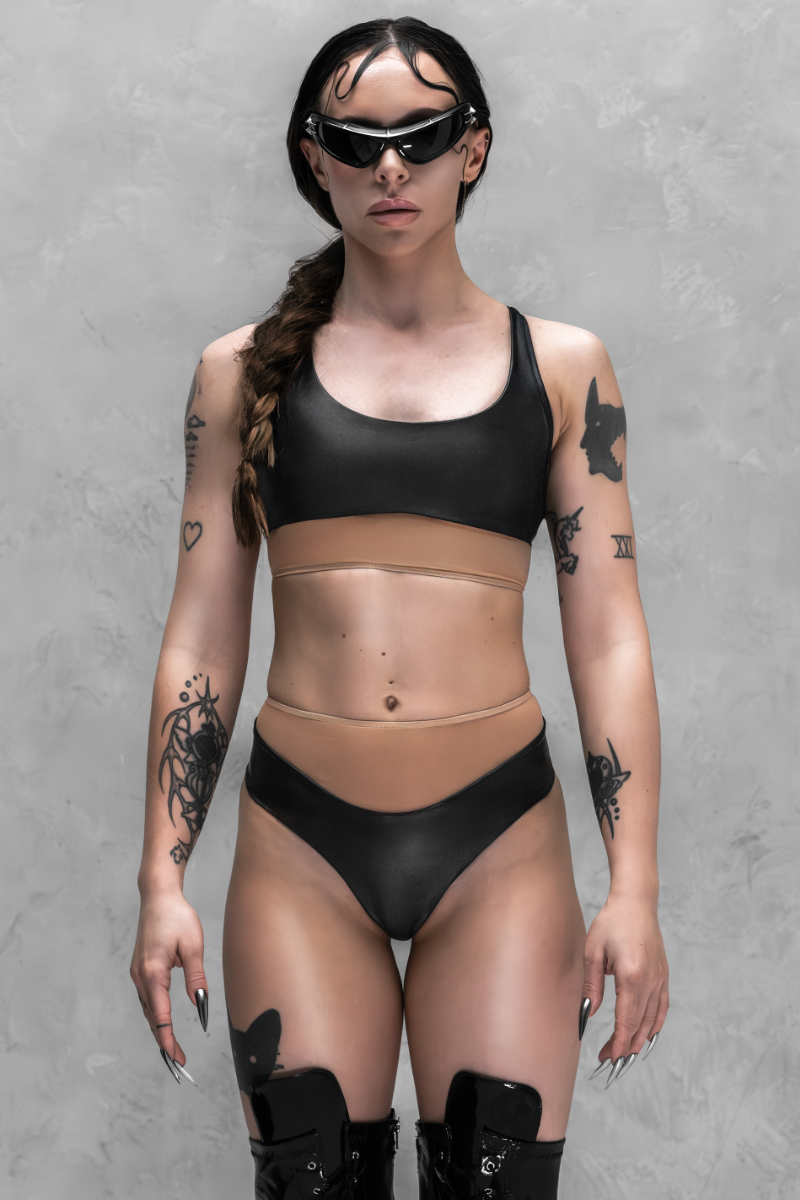 Part High Shine Lycra, part sheer mesh, this top is your beautiful system error. A cropped, body-hugging silhouette features a lower elastic band for a sculpted hold, while adjustable straps offer a custom fit.