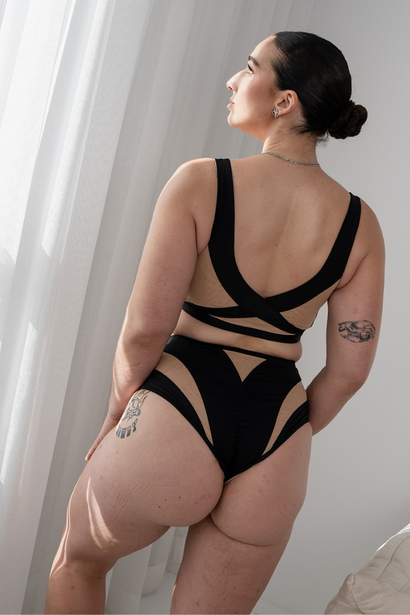 This top features a sculpted black-and-beige paneling that contours your curves creating the most flattering female silhouette.