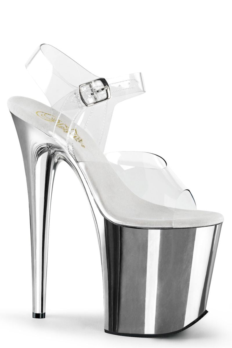 Transform your pole dancing dreams into reality with the Pleaser USA Flamingo-808 Chrome 8inch Pleasers in Silver! Imagine yourself twirling and gliding with a fabulously fierce 8" stiletto heel and a 4" platform, complete with a breathtaking silver chrome plated bottom. These ankle strap sandals aren't just shoes; they're your personal statement of strength and sass on the dance floor. ✨✨