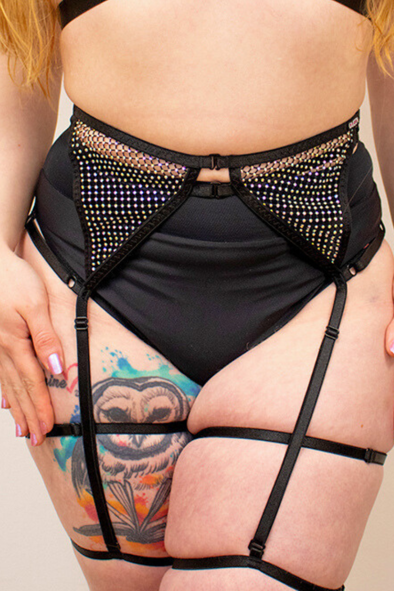Succumb to the addictive allure of the Queen Garter Belt in Opium. This seductive accessory boasts adjustable elastic straps and a convenient front clasp for a flawless fit. Enhance your pole dance attire with its empowering charm, adding a daring touch to your look and making every performance irresistibly captivating.