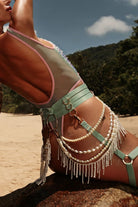The triple belt, brimming with golden rings and carabiners, sets you apart as a captivating siren of the stage. Adorn your thighs with sculpting accessories and let the aqua satin shimmer enchant your audience. It's polewear that's as daring as a mermaid's adventure – and all eyes are on you! 🧜♀️✨🔱