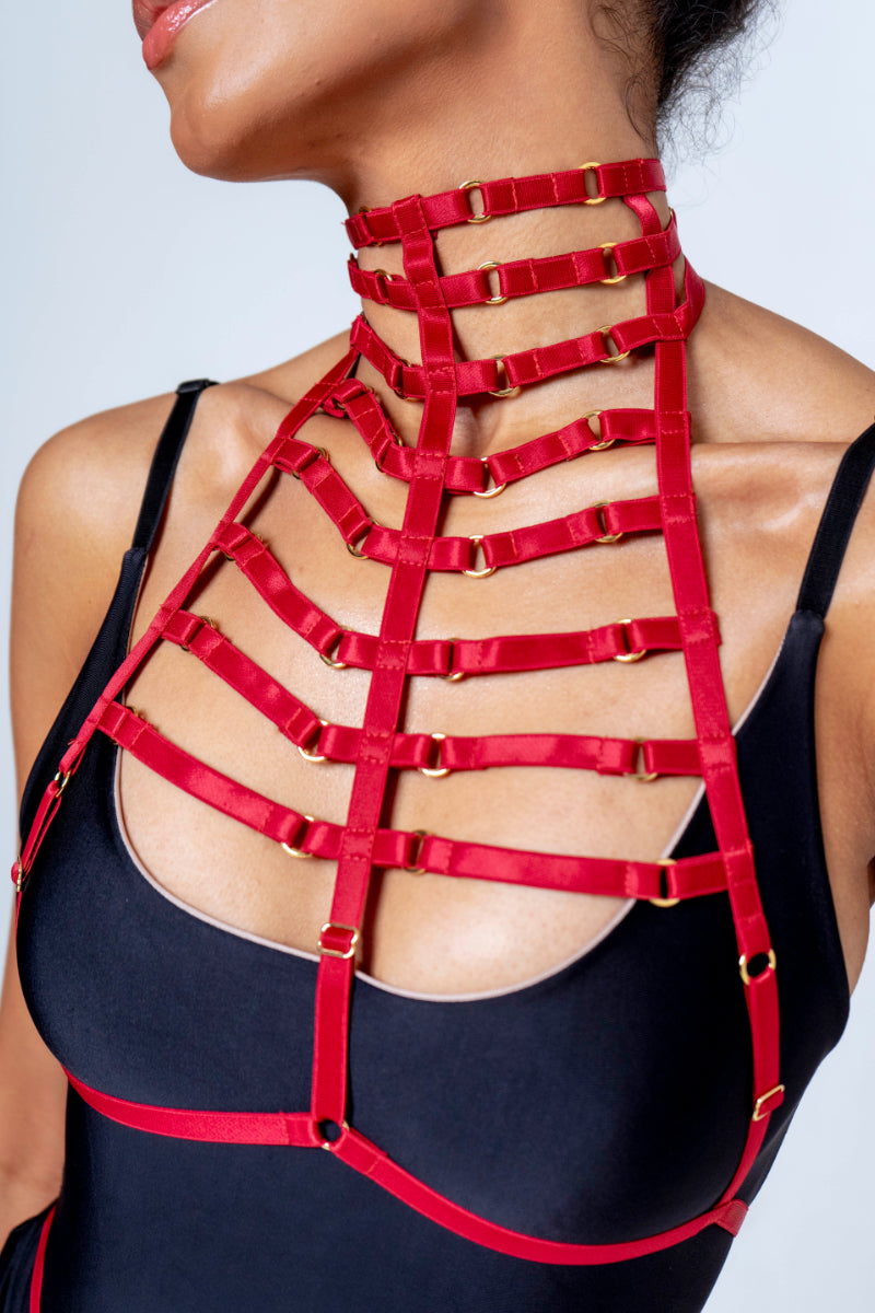 This striking high-neck design top harness features fully adjustable straps, that create a bold cage pattern guaranteeing you’re the centre of attention. With durable hardware accents, it’s perfect for pairing with your favourite pole wear, lingerie, or layering.