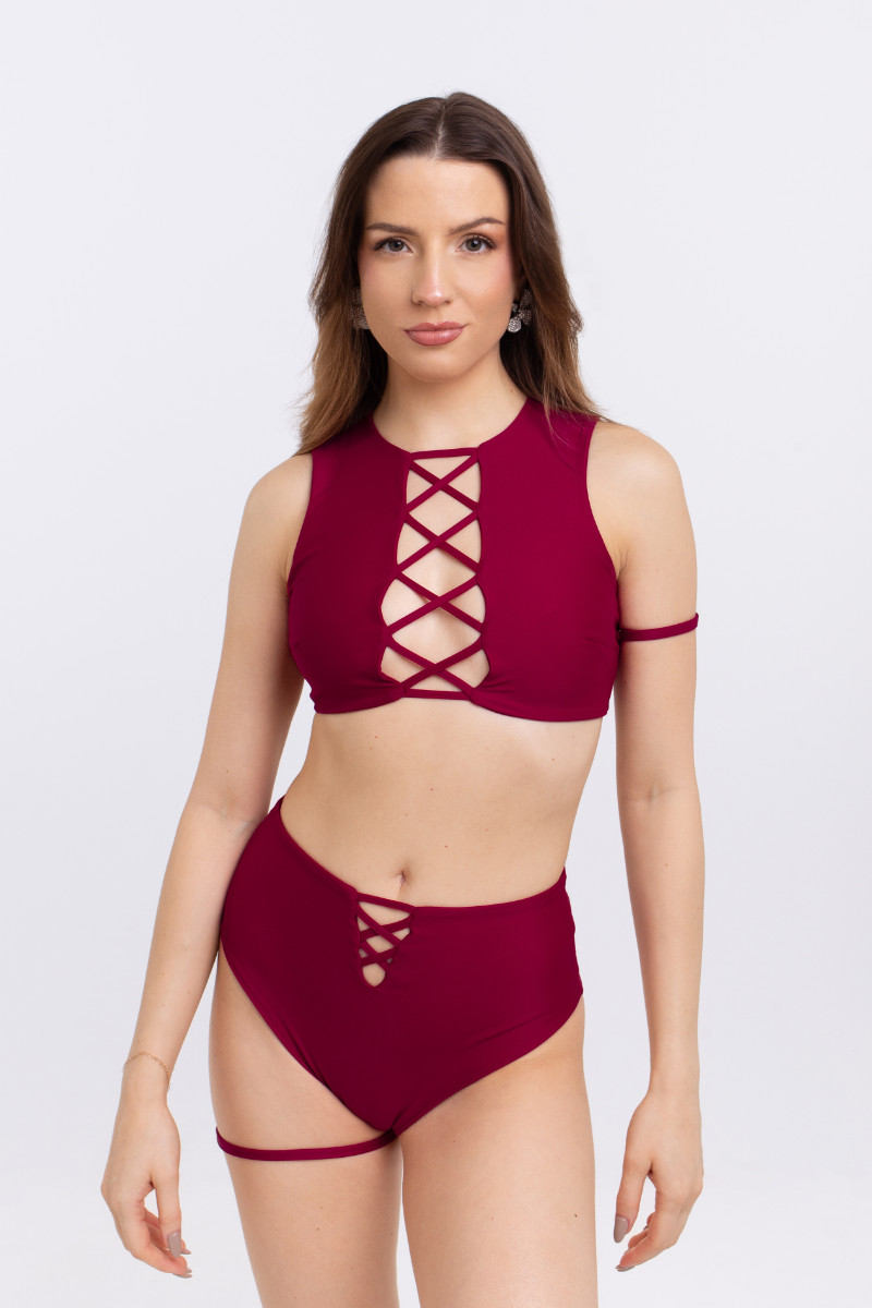 Serve looks in luscious burgundy. These high-waisted bottoms are pure drama, with a daring lattice cut-out detail that sets you apart. The high-leg cut and signature scrunch bum work together to create an unforgettable silhouette. Own your power, one mesmerising move at a time.