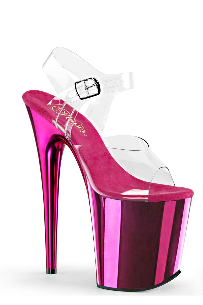Amplify your sass and class with the Pleaser USA Flamingo-808 Chrome 8inch Pleasers - Hot Pink. Vegan brilliance meets badassery with an 8-inch heel and 4-inch platform, all on a jaw-dropping chrome base and sexy clear strap. Be unapologetically you ✨✨
