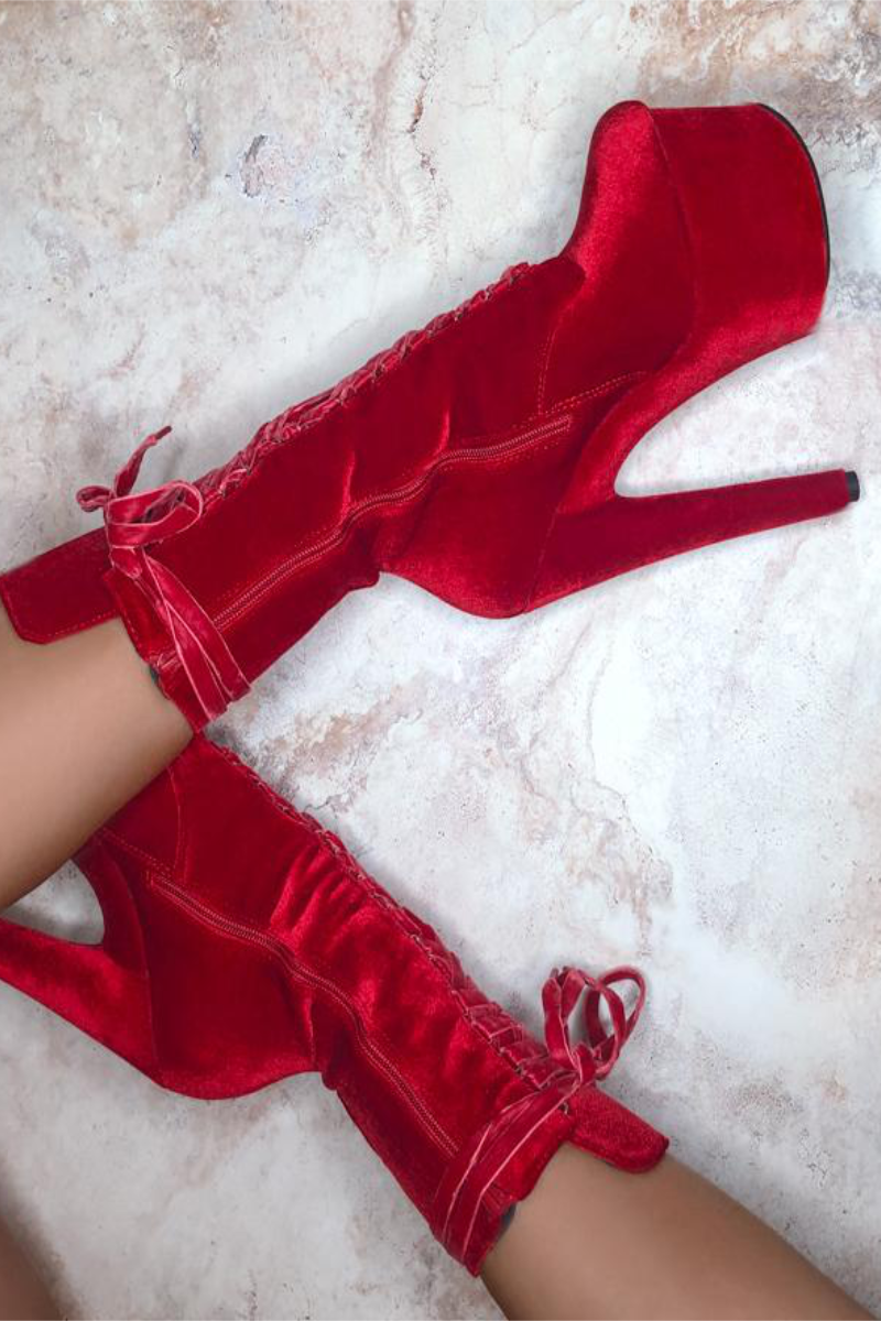 Hella Heels High BabyDoll Velvet 7inch Boots - Bad Blood