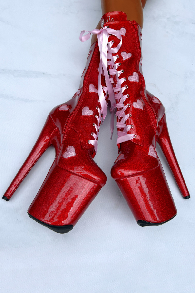 Lush Red Sparkles, Pink Glittery Heart Cutouts sealed with Pink Ribbon Shoelaces
