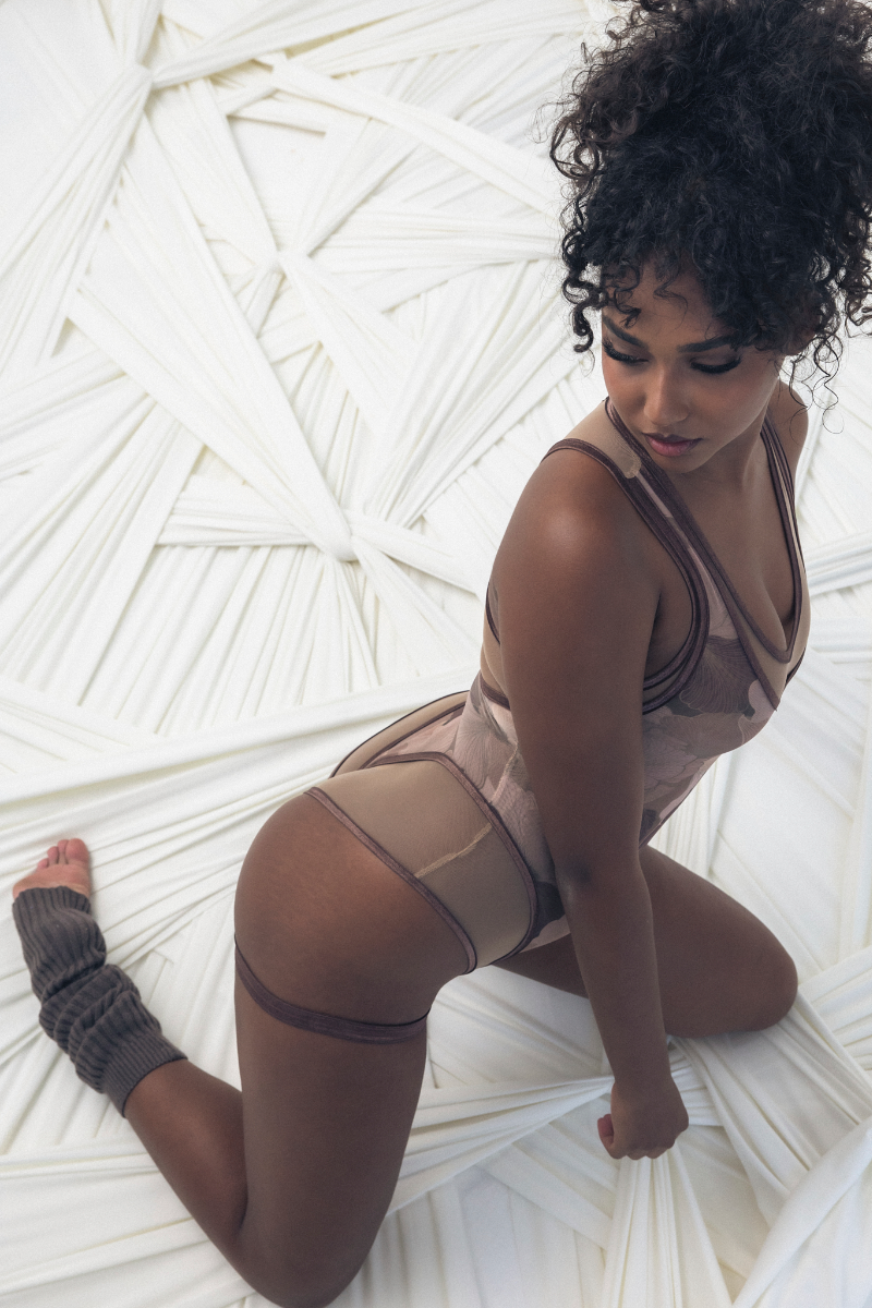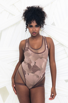 Smoke and mirrors. This bodysuit plays with illusion, layering peonies mesh over a mocha tulle underlay. Metallic piping and garter details trace your silhouette, creating a look that is pure sculpture. Featuring a high-leg cut and racer back, it’s a statement piece designed to turn heads.
