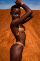 Turn up the heat in metallic gold 💫✨ Fully lined for comfort and confidence, this high-leg, cheeky cut bottom brings "barely there" vibes with a low-rise fit. Perfect for summer moves and ultimate shine. Be bold, be golden 🔥☀️ #SummerGlow