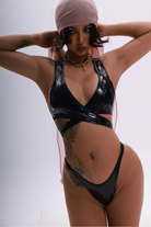 Armour up, angel. This high-shine top channels battlefield brilliance with a V-neckline and intricate cross-wrap front. The "Black Rainbow" finish shifts like an oil spill, creating a dark, iridescent shield. Finished with gold hardware and a strappy cross-back design, it’s adjustable to fit your unique shape. A striking fusion of strength and seduction.