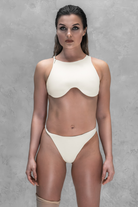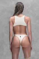 This high-rise thong, crafted from premium double-layer white fabric, offers a celestial second skin. Its single twisted seam sculpts your form, celebrating your curves with a flawless silhouette. Divine power, redefined. Pure elegance designed to empower.
