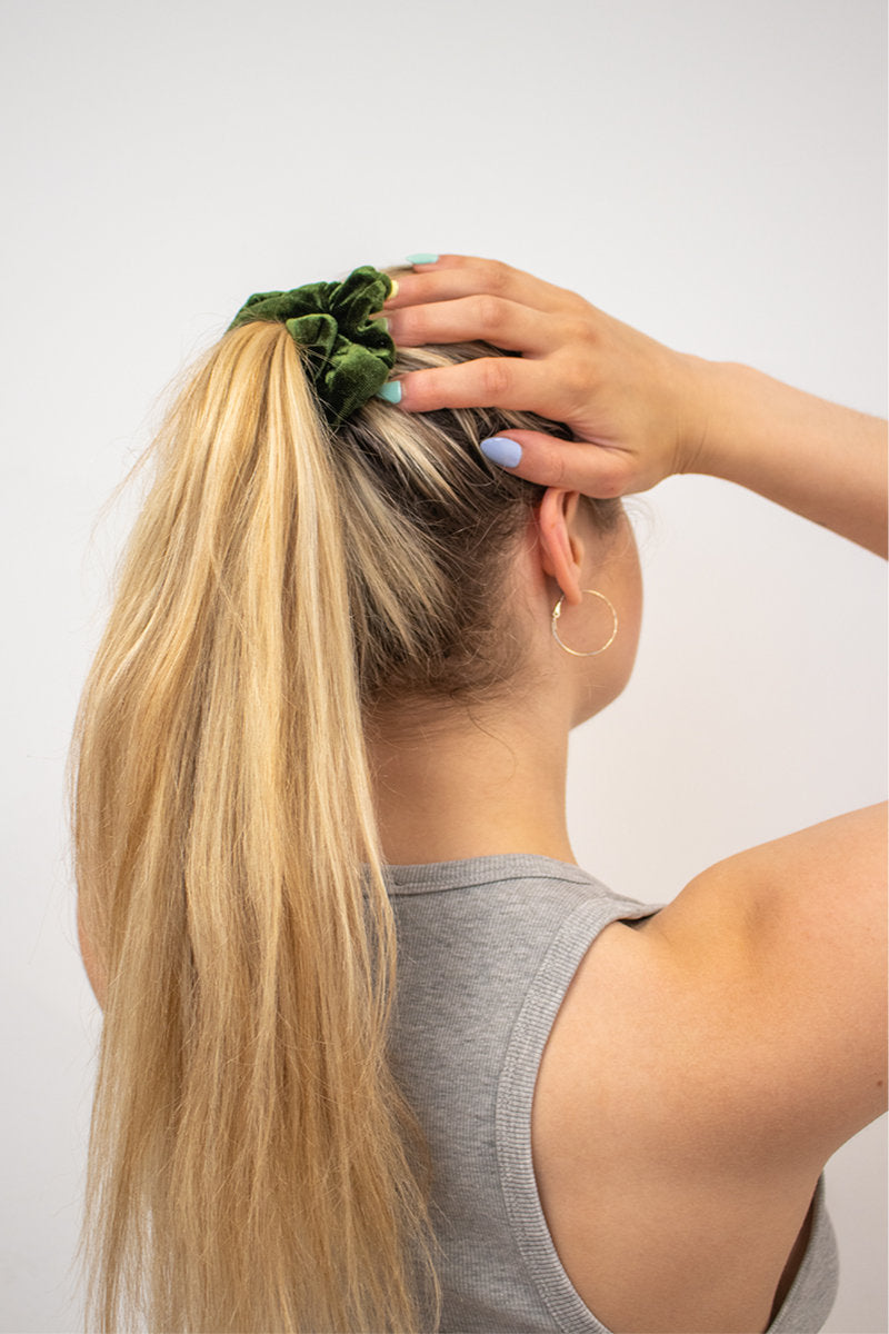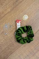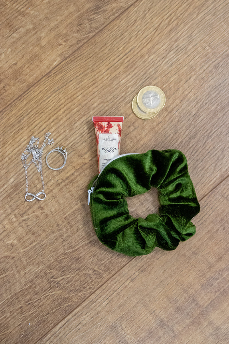 Keep your hair flawless and your treasures hidden with our emerald green velvet scrunchie! Perfect for glamorous evenings or chic brunches, its luxurious softness protects your locks while a hidden zip keeps small valuables safe. Whether in your hair or on your wrist, this accessory adds a touch of timeless elegance to any look!
