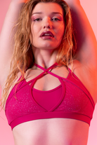 Lined | Scoop Neck | Soft Lycra | Glitter Mesh Overlay | Criss-Cross Straps | Clasp Closure | Non Padded |