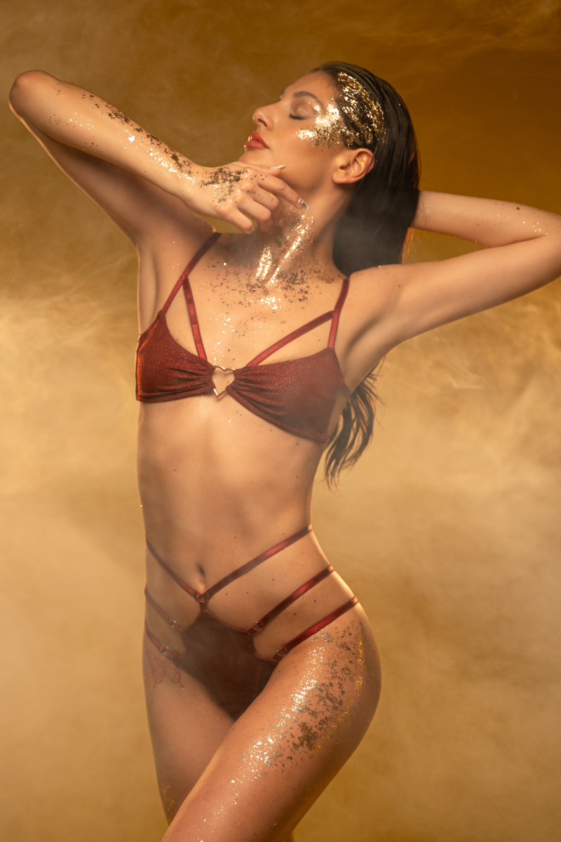 Stardust dipped in scarlet. This chilli red glitter triangle top offers a tight, low-support fit that shimmers with celestial fire. Fully lined with no padding for a natural silhouette, it features a delicate two-strap back and a nickel-free metallic heart, a fiery gem for your ethereal flow.