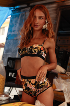 A delicious dark look. This square neck top offers structure and style, featuring underwired half cups and Rolling's signature band for support you can trust. The black floral print, rich with strawberries, peaches, and papaya, adds a sweet twist. Adjust the straps for your perfect fit.