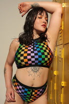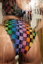 Dive into the kaleidoscope of colours with the Rolling Bonde Shorts! 🌟 These high-waisted, high-leg shorts feature a vibrant mosaic of bright, cheerful squares, each from the rainbow spectrum. The neatly arranged grid pattern creates a lively patchwork, while the alternating crisp black linings add contrast and grace. Complete with a black elastic waistband and zipper for ultimate flexibility and flair. ✨
