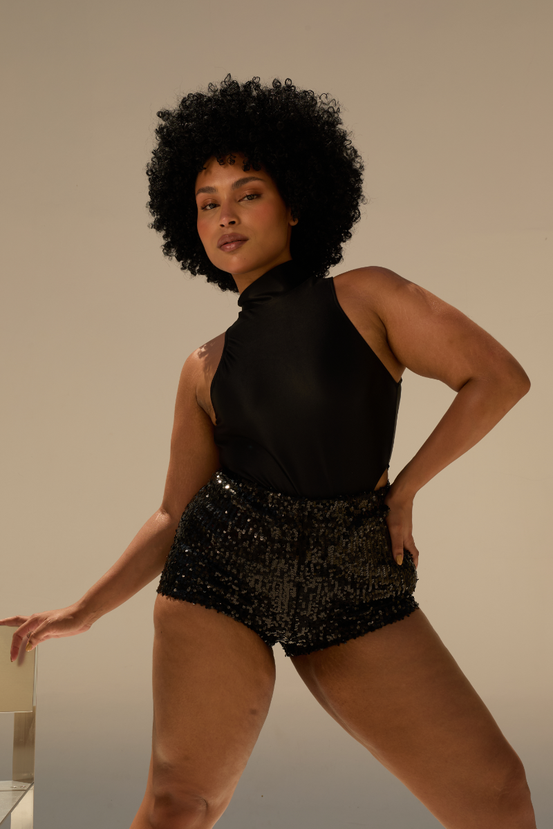 A dark romance, coded for the future. This silky black satin bodysuit feels like liquid night against your skin. The daring open back and super cheeky high leg cut are secured by a delicate ribbon tie halter neck. It’s pure minimalist seduction, designed for maximum impact.