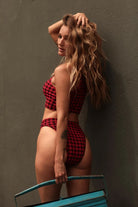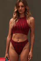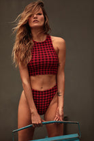 This high-neck, halter crop is pure horsepower, hugging every curve with a fierce red-and-black checkered pattern that demands attention. Built for those who live fast and wild—this top is pure pole seduction at full throttle.