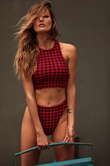 • High-neck | crop style | Bold red and black checkered pattern | Snug fit that accentuates the upper body | Halter Top