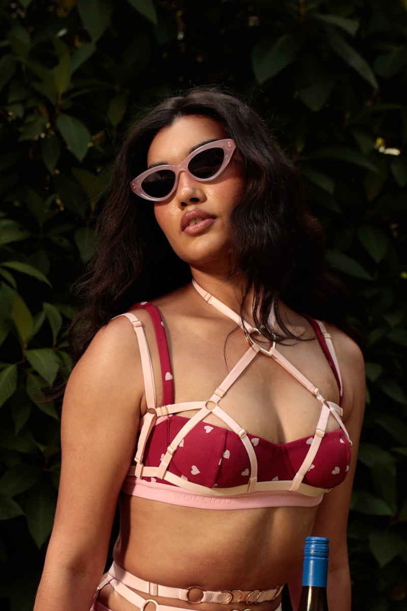 Roses are red, this harness is pink—*but it’s not here for poetry. The Sweetheart Harness Top - Blush mixes baby pink elastic with gold carabiner accents, proving that soft can be strong and sweet can be savage.