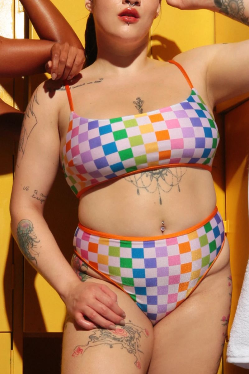 Bring excitement with the Rolling Vento Reversible Shorts! 🌈✨ A vibrant mosaic of bright, cheerful squares, each one a unique hue from the rainbow spectrum. The squares are arranged in a neat, grid-like check pattern, creating a lively patchwork that dances across the fabric. Framed with delicate linings, these high-waisted shorts balance the bold rainbow hues with subtle grace and whimsy. Reversible with a plain pink design and orange biases, offering medium coverage. 💖💃