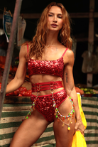 Ready for your solo? This red sequin top is pure main character energy. A classic scoop neckline is supported by adjustable straps and a double back strap detail. It's security, but make it sparkle. Pair with the matching shorts for a showstopping look.