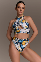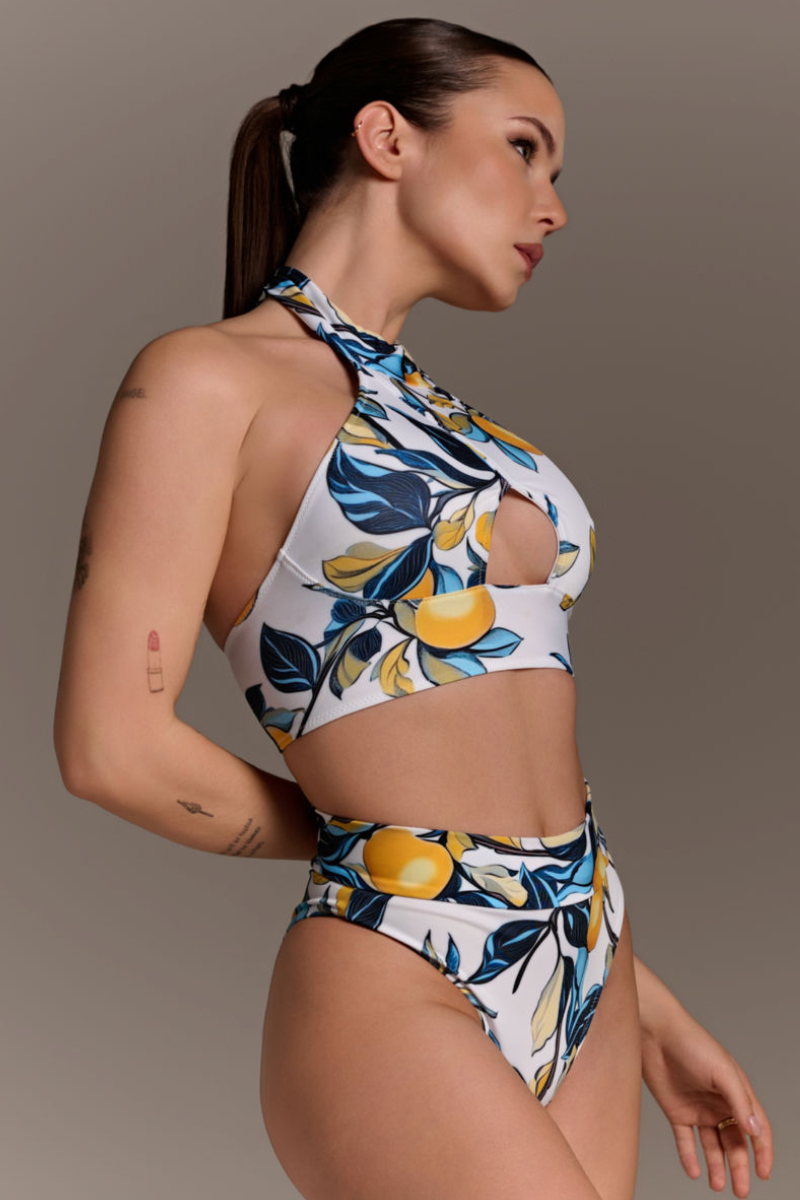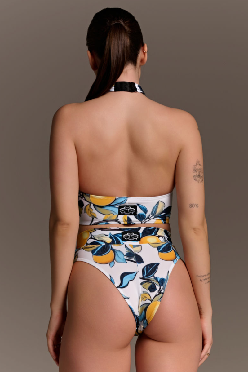 When life gives you lemons, wear them. This zesty halter top combines sweet and sassy, featuring a classy lemon print on crisp white Lycra. It provides full front coverage with a playful cutout, giving you support with a hint of cheekiness. The open back design and adjustable neck closure ensure a perfect, comfortable fit that moves with you. It’s a refreshing twist on a classic style, designed to look flawless wherever you go.